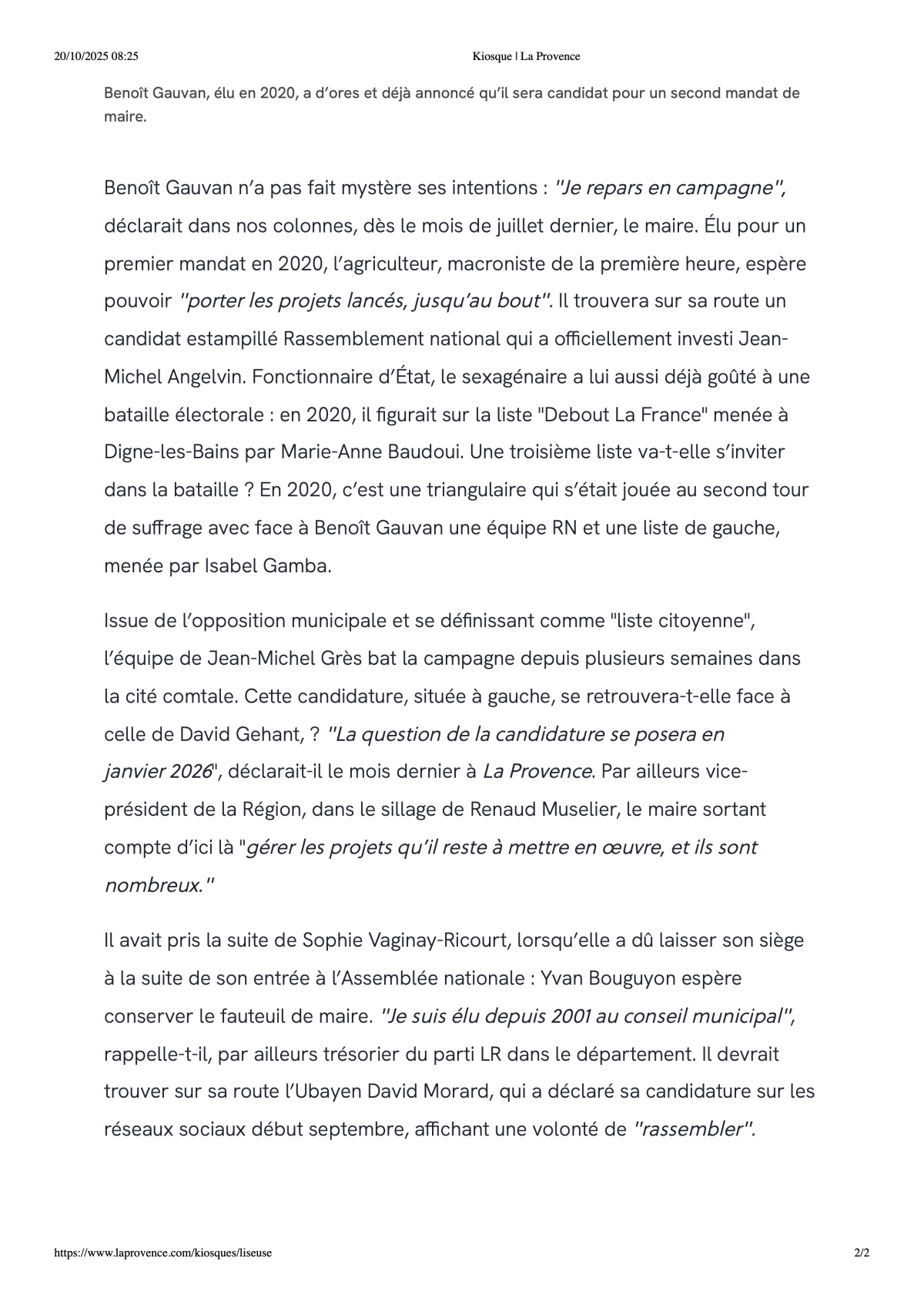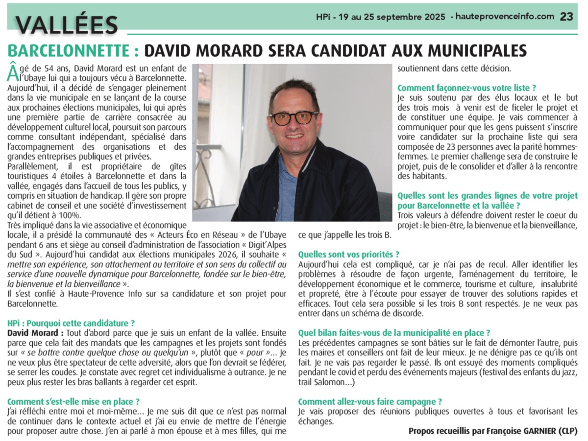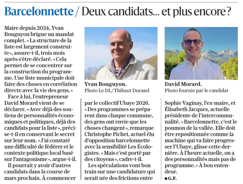 Maire depuis 2024, Yvan Bouguyon brigue un mandat complet. « La structure de la liste est largement construite », assure-t-il, trois mois après s’être déclaré. « Cela permet de se concentrer sur la construction du programme. Une liste municipale doit faire des choses en corrélation directe avec la vie des gens. »Face à lui, l’entrepreneur David Morard vient de se déclarer. « Avec déjà des soutiens de personnalités économiques et politiques, déjà des candidats pour la liste », précise-t-il en conservant le secret sur leur nom. « J’ai constaté une difficulté de fédérer et le contexte politique local basé sur l’antagonisme », argue-t-il.Il pourrait y avoir d’autres candidats dans la course de mars prochain. À commencer par le collectif Ubaye 2026. « Des programmes se préparent dans chaque commune, des gens ont envie que les choses changent », remarque Christophe Pichet, actuel élu d’opposition barcelonnette avec la sensibilité Les Écologistes. « Mais c’est porté par des citoyens », cadre-t-il.